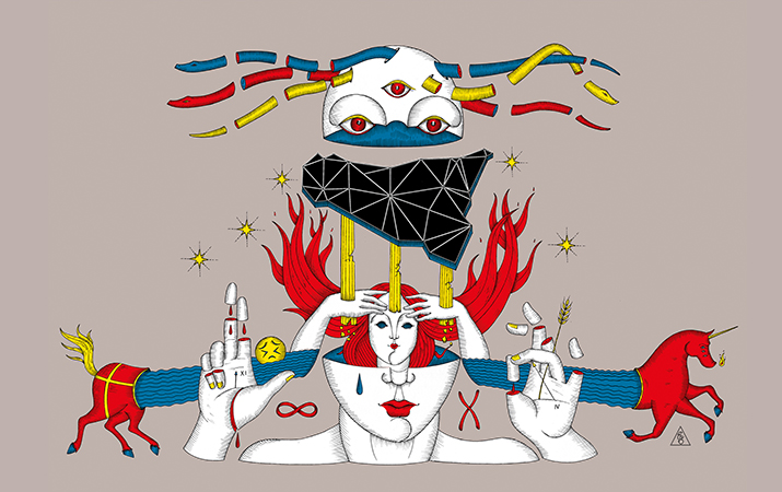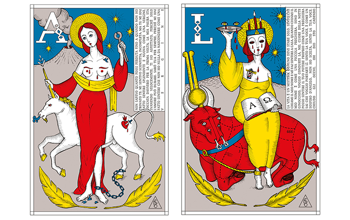 Ha la testa piena di bestiari medioevali, reliquie sghembe, martiri tatuate, lezioni di catechismo seguite dall’ultimo banco, icone sacre e icone pop. Ama disegnare donne, puttane e madonne coi colori dei tarocchi, che a farci caso sono pure gli stessi colori del Bauhaus. Ama anche i gatti neri perché, forse, è anche una strega.