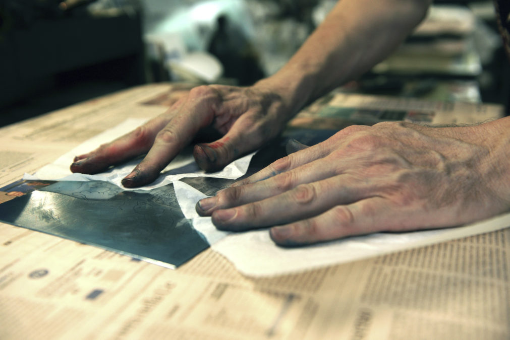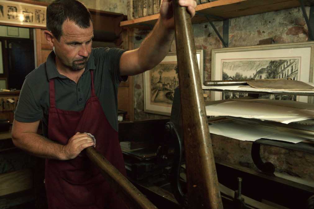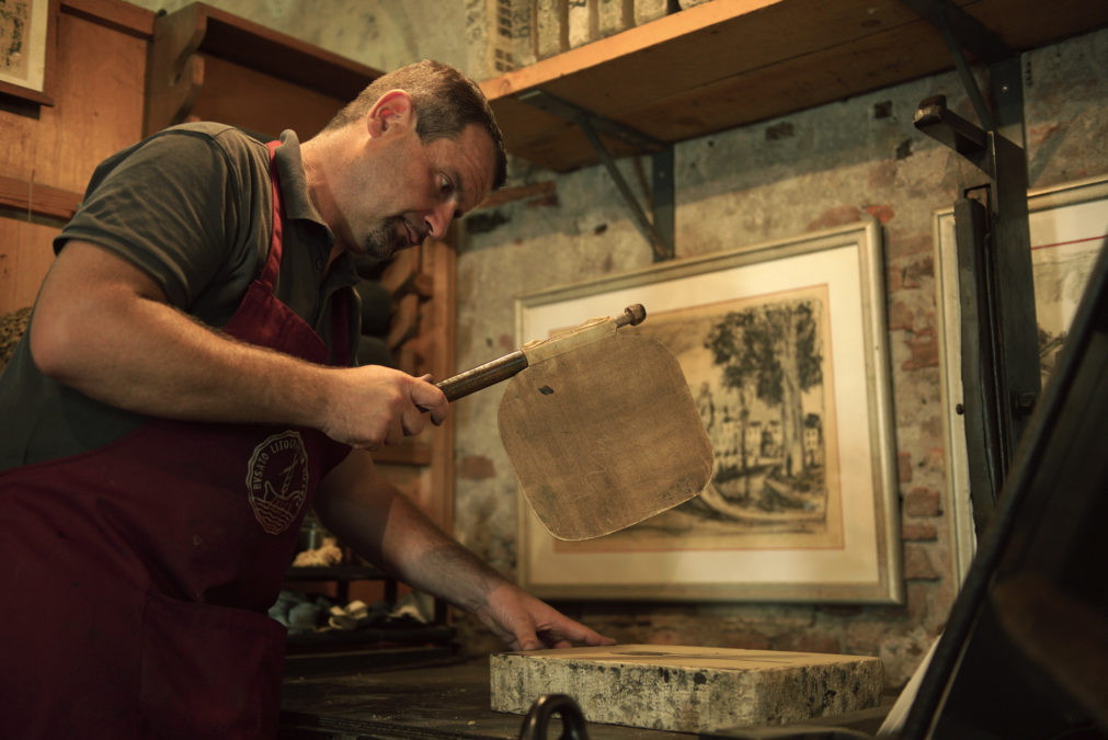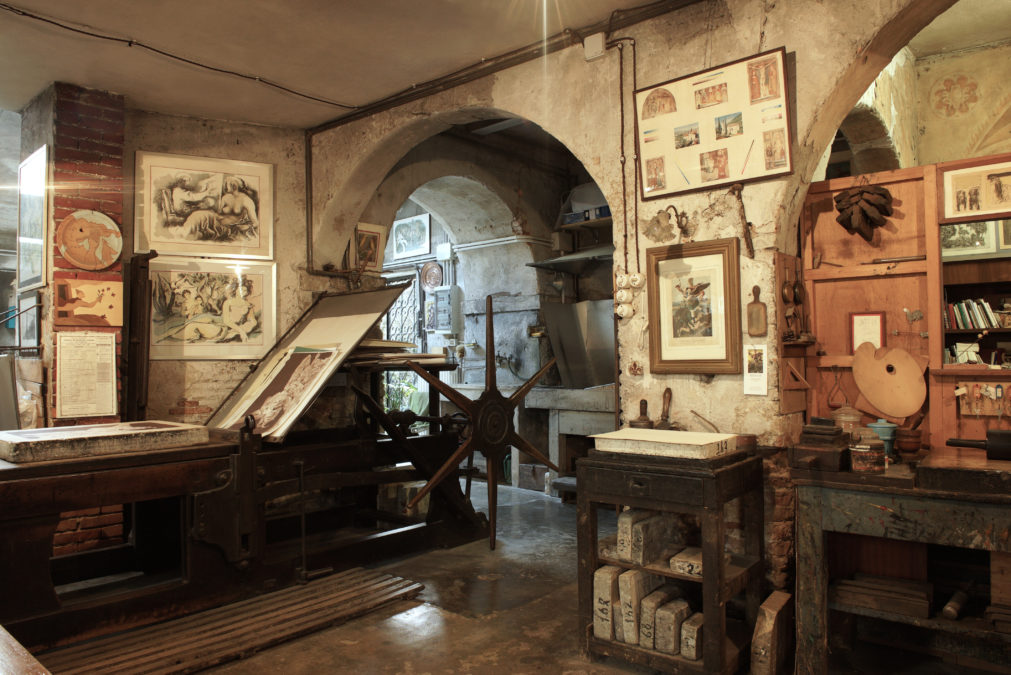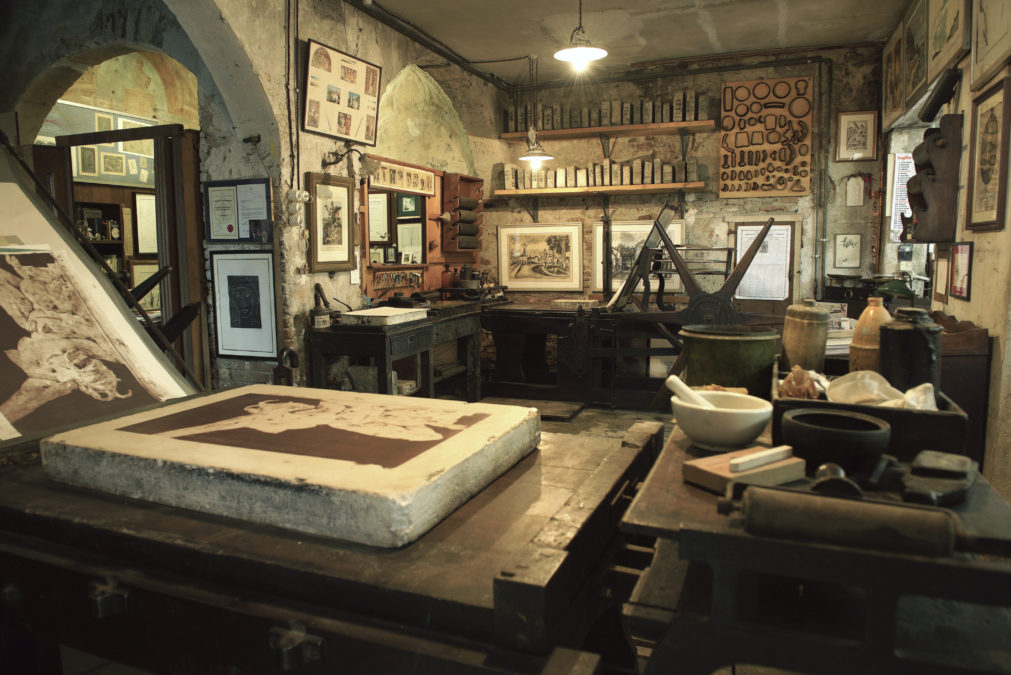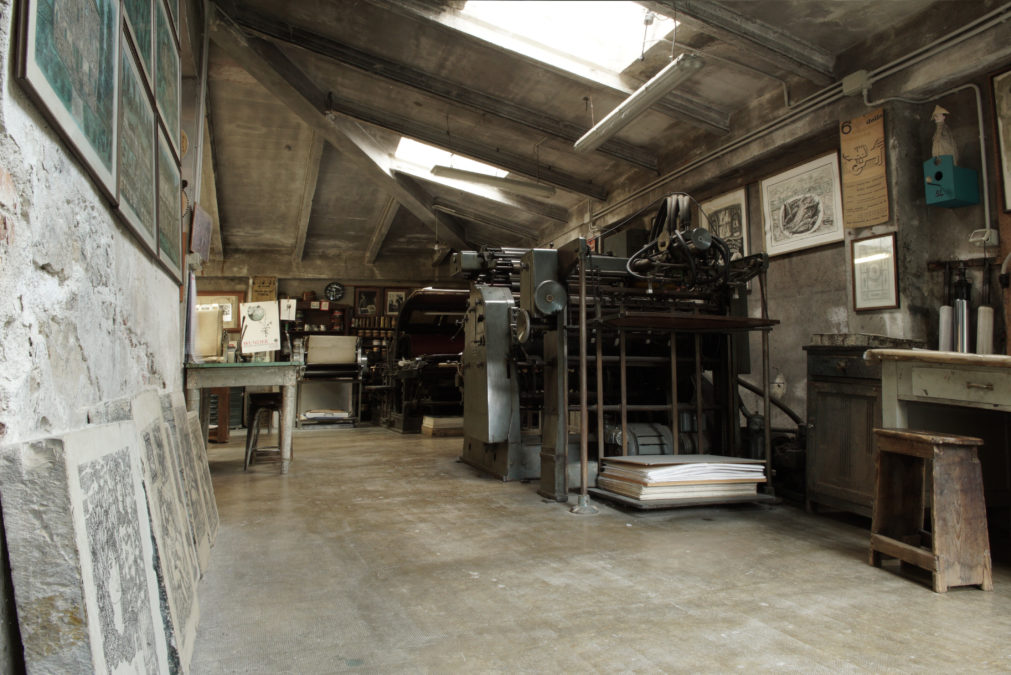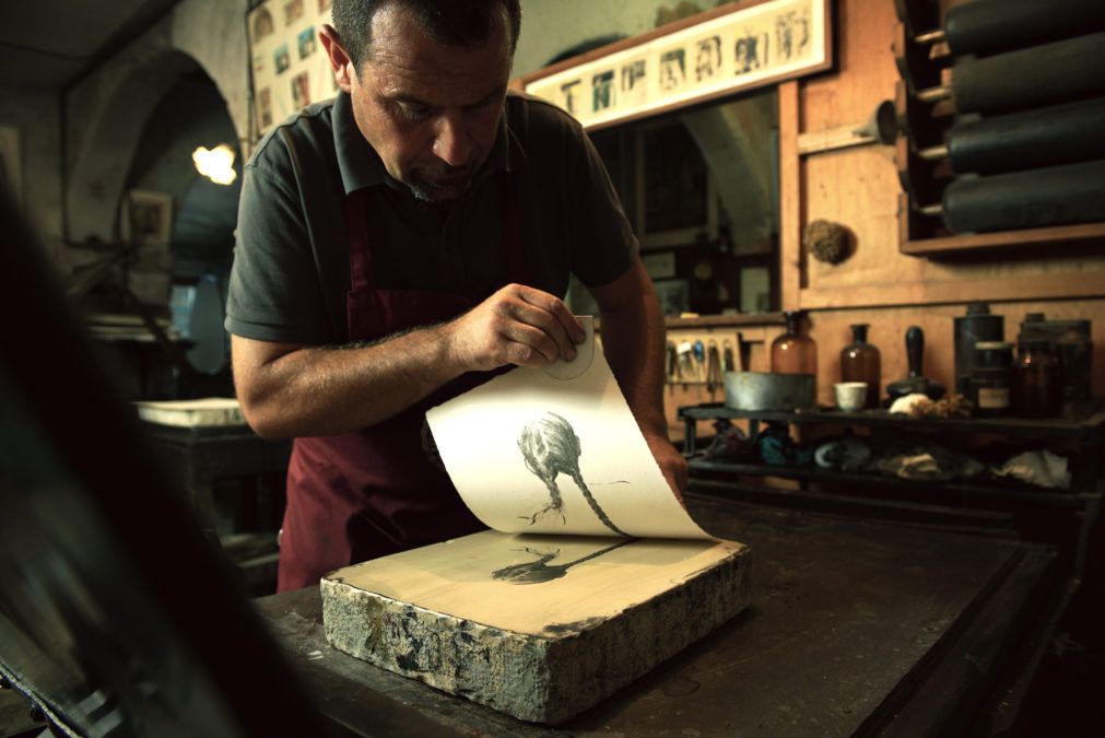 Giancarlo porta avanti con dedizione di stampatore che nonno Ottorino fondò nel 1946. Negli anni ’60, grazie a suo padre Giuliano, si aprì una stagione davvero fiorente, che ebbe come interlocutori principali Neri Pozza e Tono Zancanaro. Da allora a rendere unica la stamperia è la speciale intesa tra stampatore e artista. Trascorre le sue giornate tra torchi, matrici, inchiostri e carta. Si occupa da sempre di calcografia e litografia, attraverso sistemi di stampa esclusivamente artigianali rimasti immutati nel tempo.