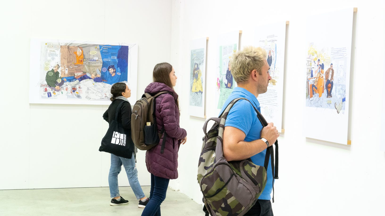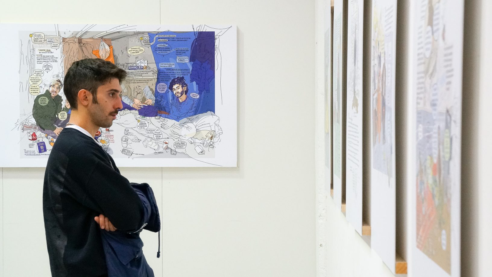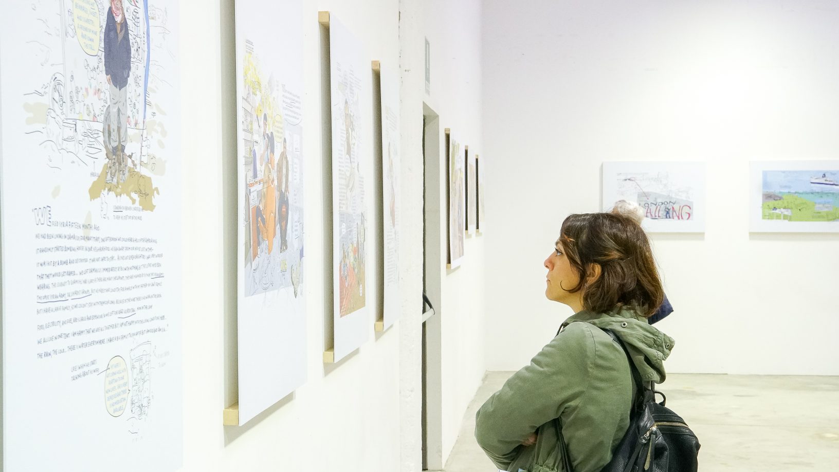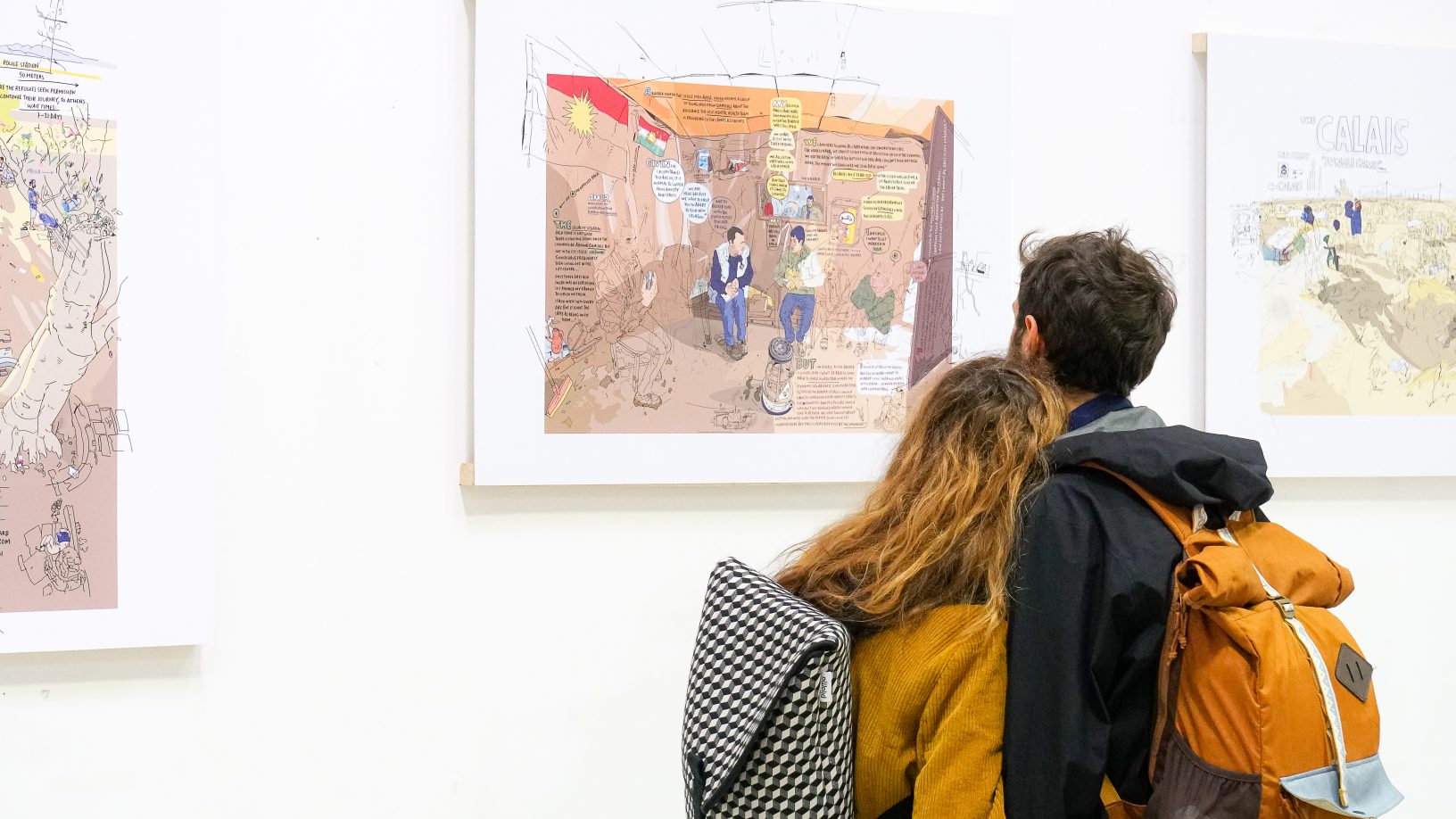 La mostra espone il brillante lavoro dell’artista Olivier Kugler, i cui disegni raccontano le storie di alcuni rifugiati siriani. I disegni – raccolti nel libro Escaping Wars and Waves – documentano le vite di persone e famiglie che lui ha conosciuto personalmente nel Kurdistan iracheno, nell’isola turistica di Kos e nel campo di Calais, nell’ambito di un reportage condotto per Medici Senza Frontiere.