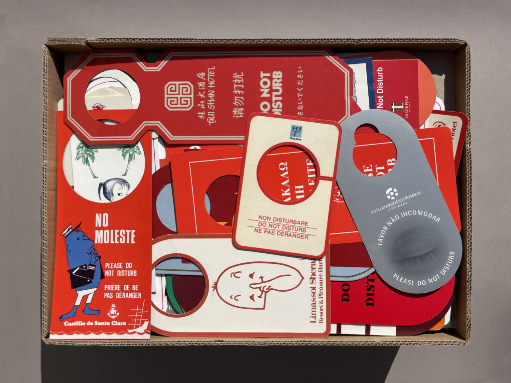 Edoardo Flores nel corso della sua vita ha raccolto oltre 21.000 cartellini “Do Not Disturb” provenienti da hotel di tutto il mondo. La selezione in mostra (poco più del 2%) racconta come un oggetto semplice che spesso passa inosservato, possa farsi specchio delle culture grafiche, delle abitudini e dell’immaginario visivo di paesi lontani. Dentro a ogni cartoncino si intravedono codici condivisi, ma anche gestualità locali, variazioni spontanee, interessanti risultati grafici nati (forse) inconsapevolmente.