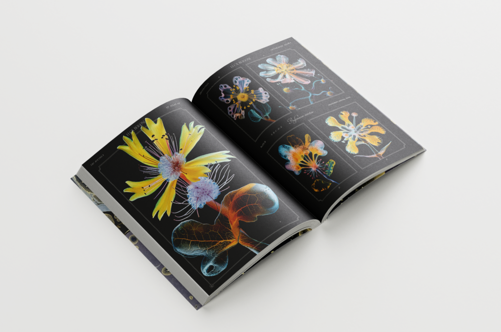 Gli artistə presenti utilizzano AI, CGI, modellazione 3D e codici informatici per immaginare regni botanici inesplorati: fiori perduti a causa dell’estinzione, ibridi mai esistiti e strutture vegetali plasmate da possibilità algoritmiche.