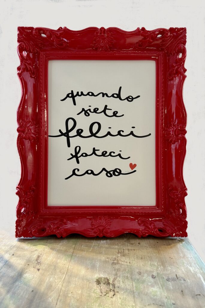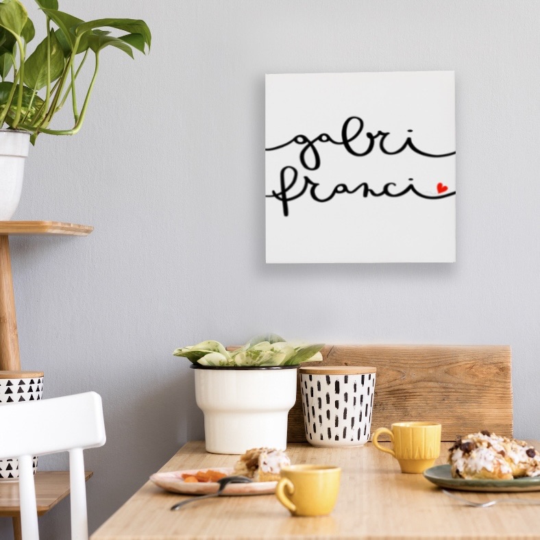 Al tavolo di Annamaria Ferrero troverete stampe e tele già pronte, ma potrete anche commissionare lavori personalizzati con i vostri nomi, parole o frasi.